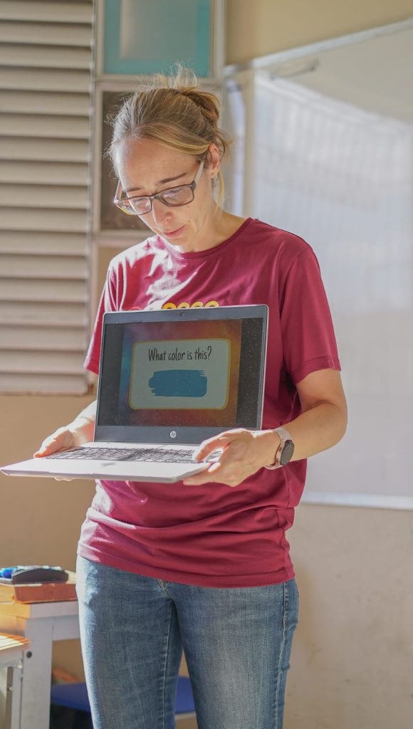 Durante a primeira aula quisemos principalmente descobrir o que os jovens já sabiam de inglês. Fizemos algumas perguntas, praticamos frases simples como “Good afternoon, teacher” e “How are you?”, e também fizemos um jogo para aprender as cores em inglês. Foi uma maneira leve e divertida de quebrar o gelo e entender qual era o nível da turma.