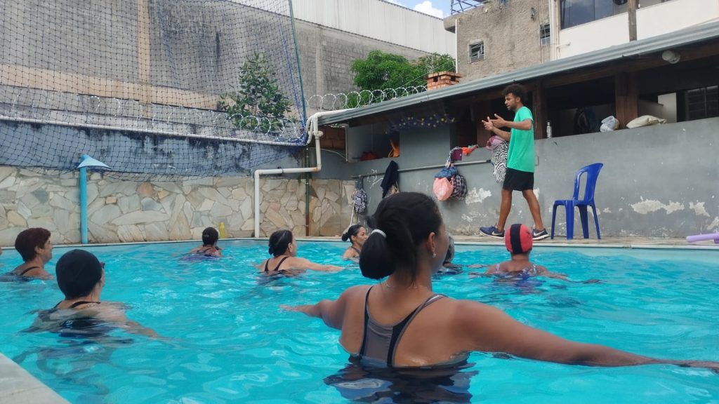 As aulas são conduzidas pelo professor Samuel, que orienta cada exercício com dedicação e entusiasmo. Na água, as participantes movimentam o corpo de forma segura e saudável, trabalhando força, resistência e flexibilidade. A hidroginástica é uma excelente atividade física, pois reduz o impacto nas articulações e promove saúde e bem-estar para mulheres de todas as idades.